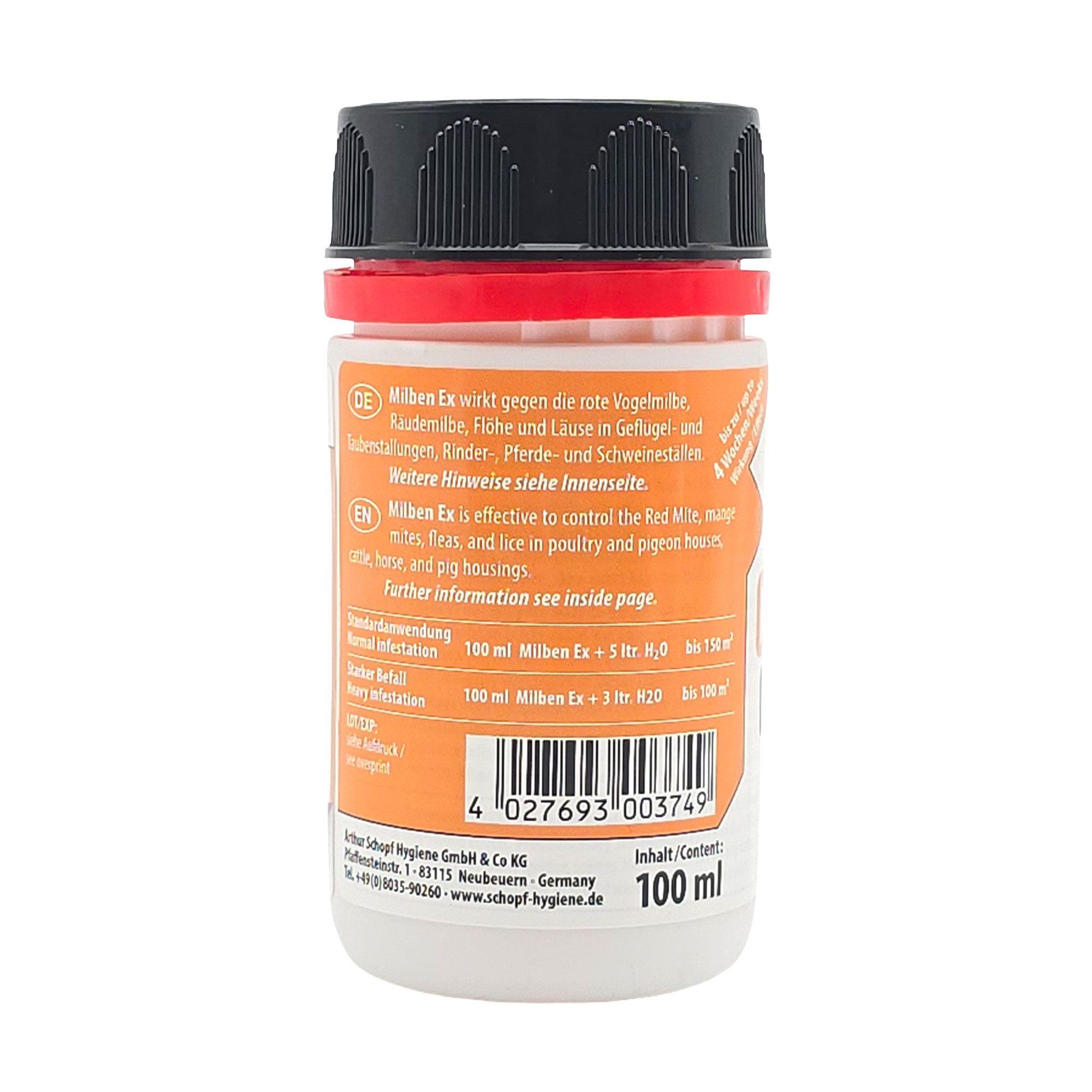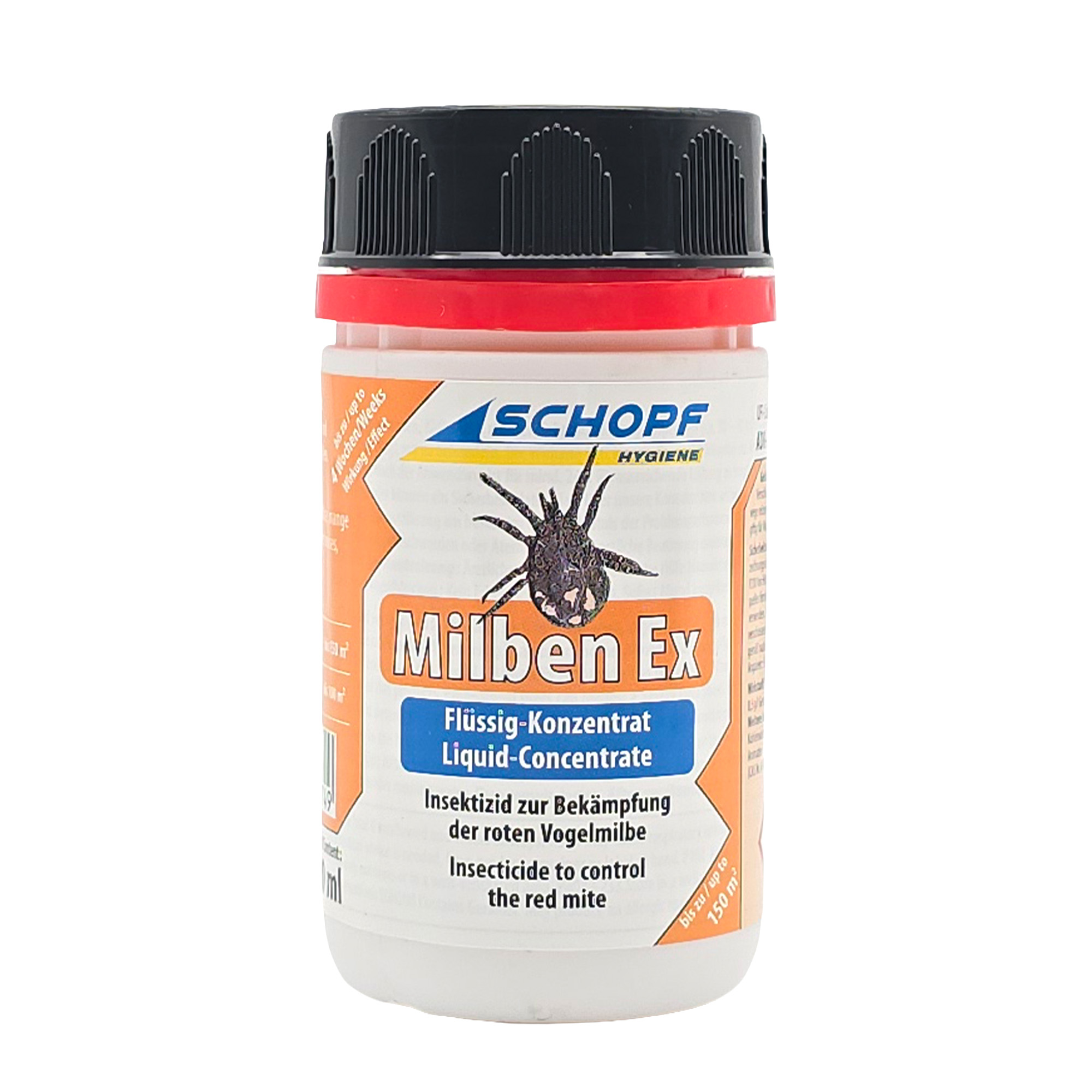 - Milben Ex ist ein Sprüh-Konzentrat zur Bekämpfung der roten Vogelmilbe, sowie gegen Haar- und Federlinge, Zecken und Grasmilben, insbesondere in Geflügel-Stallungen.