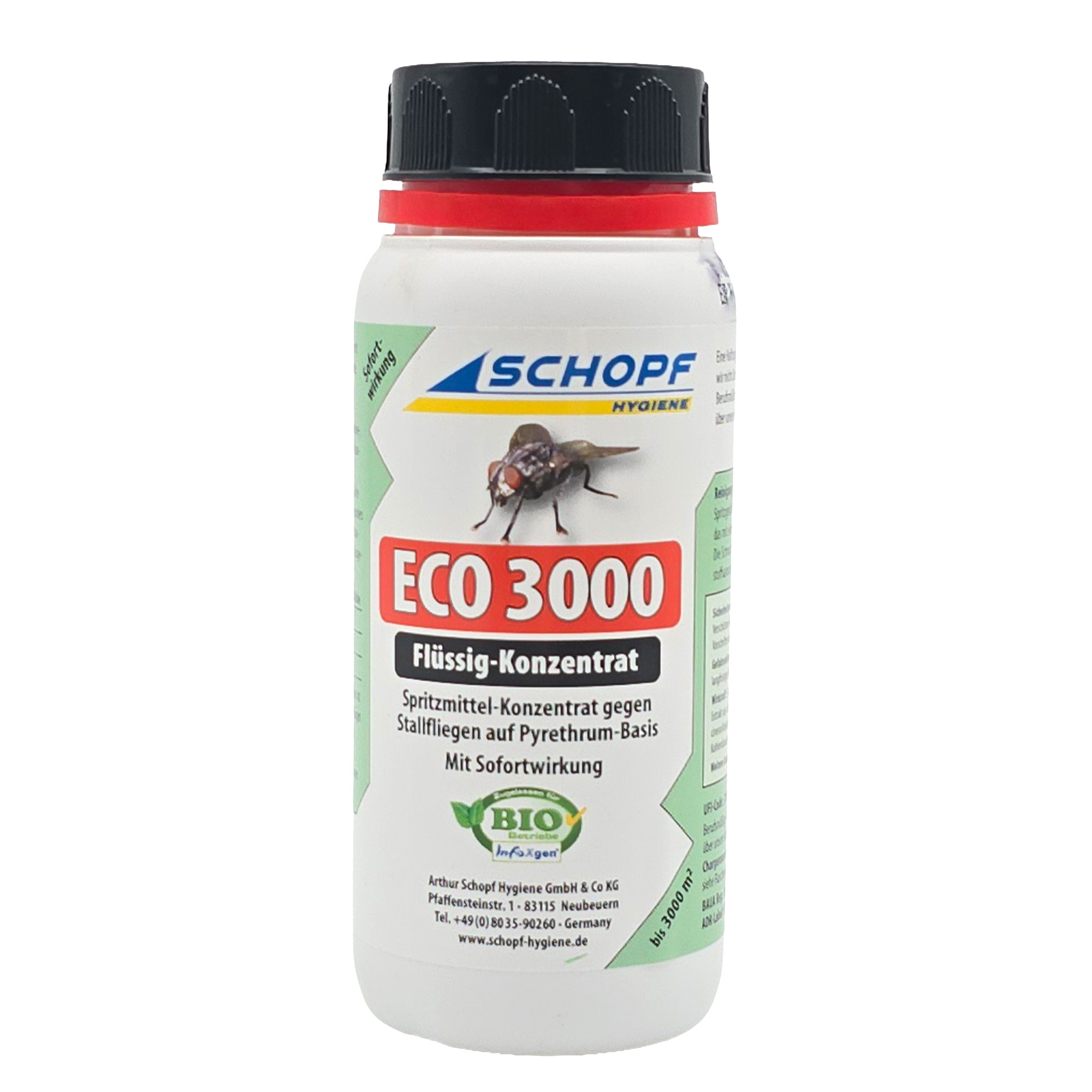 - Bio 3000 Konzentrat ist ein Insektizid auf Pyrethrum-Basis (Crysanthemen) mit Sofortwirkung gegen Stallfliegen und geeignet für Bio-Betriebe. Durch die Ausbringung werden die von Fliegen, Mücken und Bremsen besetzten Flächen im Stall, sowie die Umgebung behandelt. Rinder-, Kälber-, Schweine-, Legehennen-Ställe können mit Bio 3000 Konzentrat gut behandelt werden. Das fertige Spritzmittel wird besonders über die von Fliegen bevorzugten Flächen mittels eines professionellen Nebelgerätes, Rückenspritze oder eines Handsprühers ausgebracht.