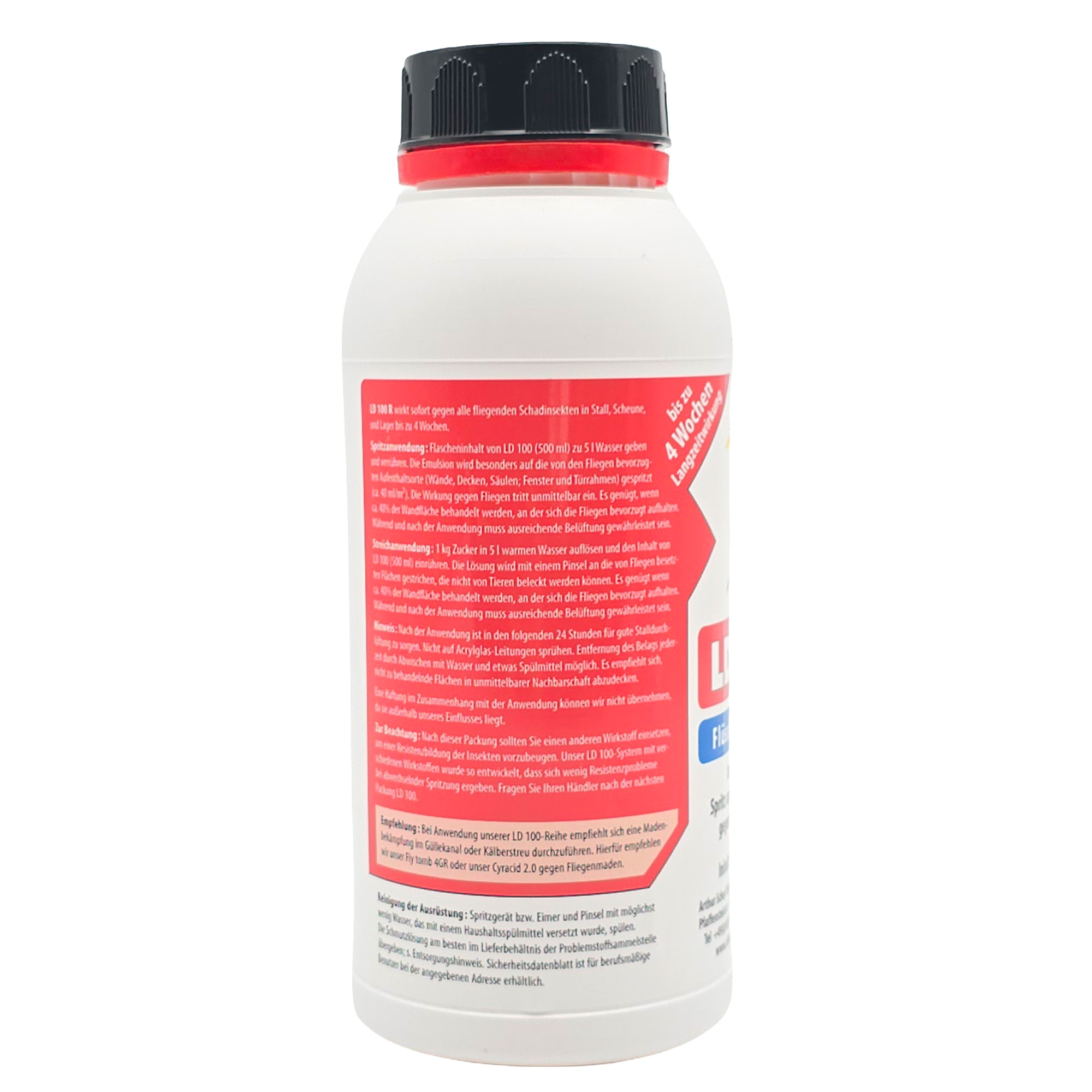- Durch die gezielte Anwendung auf die von Fliegen besetzten Flächen im Spritz- oder Streichverfahren wirkt LD 100 bis 4 Wochen in Rinder-, Schweine-, Legehennen-Ställen.