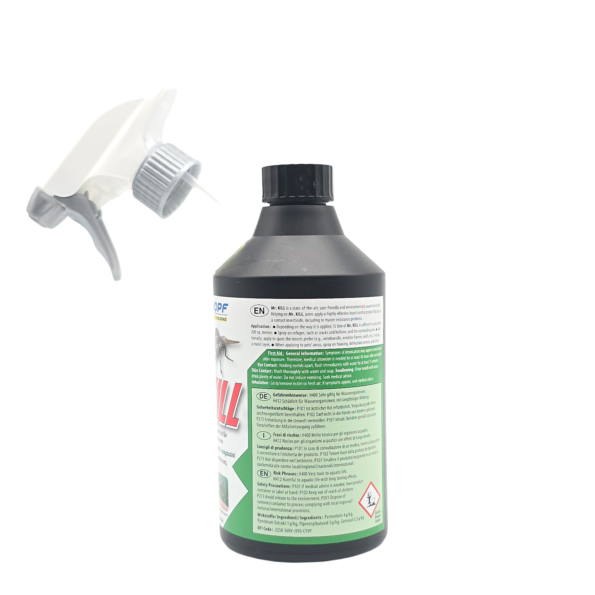 - Mr. Kill ist ein gebrauchsfertiges Insektizid mit pyrethroiden Wirkstoffkomplex für den landwirtschaftlichen Bereich, Haushalt und Gewerbe. Mr. Kill wirkt gegen alle fliegenden und kriechenden Schadinsekten.