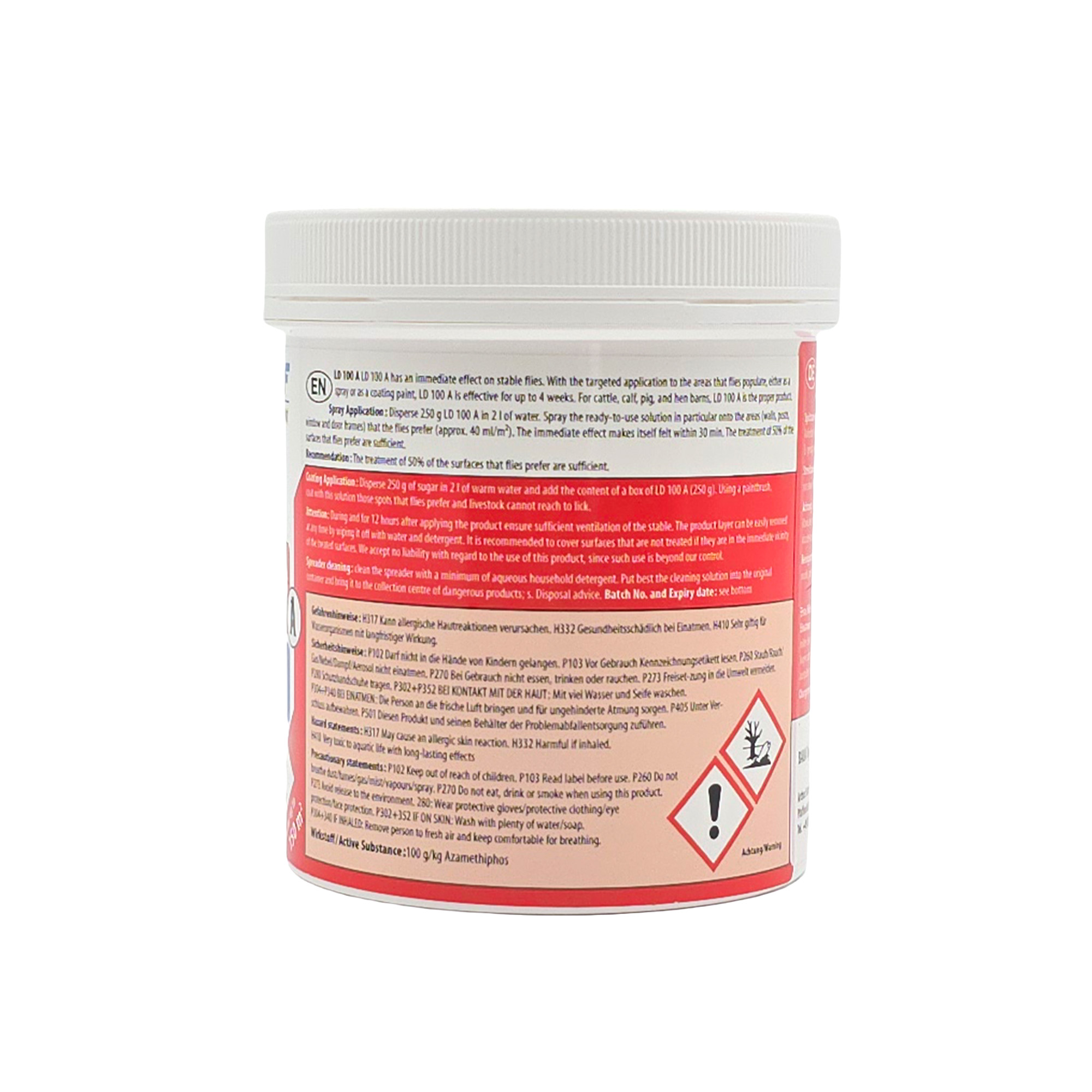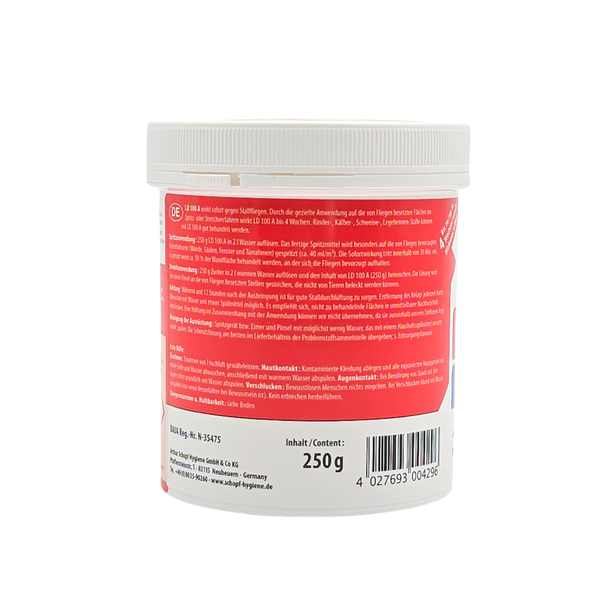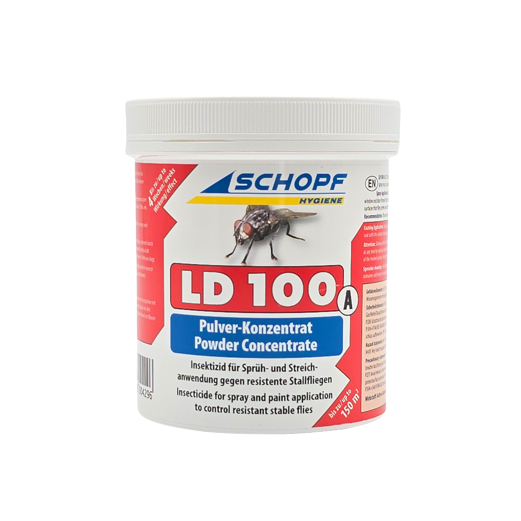 - LD 100 A ist ein Spritz- und Streichmittelkonzentrat gegen Fliegen auf Basis von Azamethiphos. Durch die gezielte Anwendung auf die von Fliegen besetzten Flächen im Spritz- oder Streichverfahren wirkt LD 100 A bis 4 Wochen in Rinder-, Schweine-, Legehennen-Ställen.