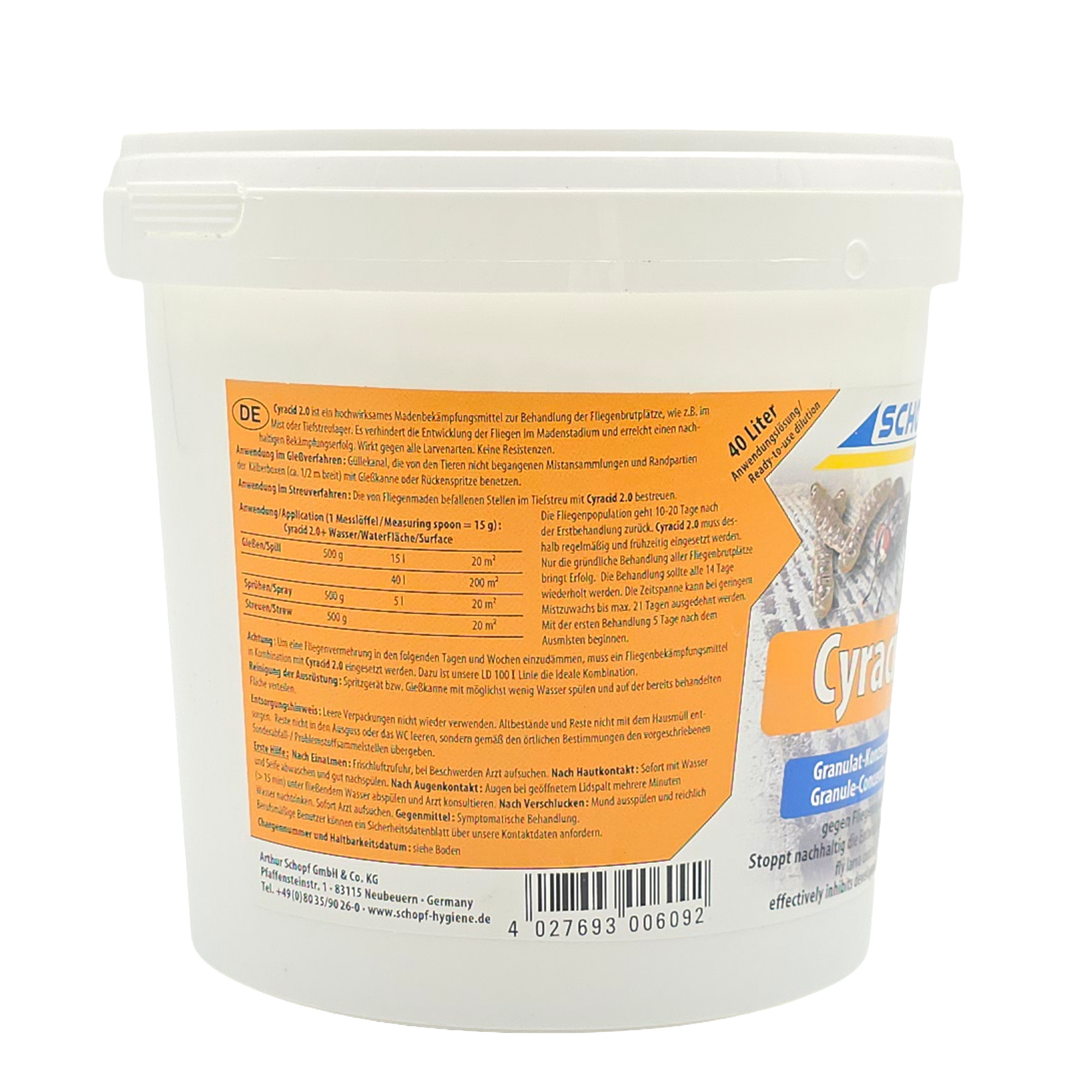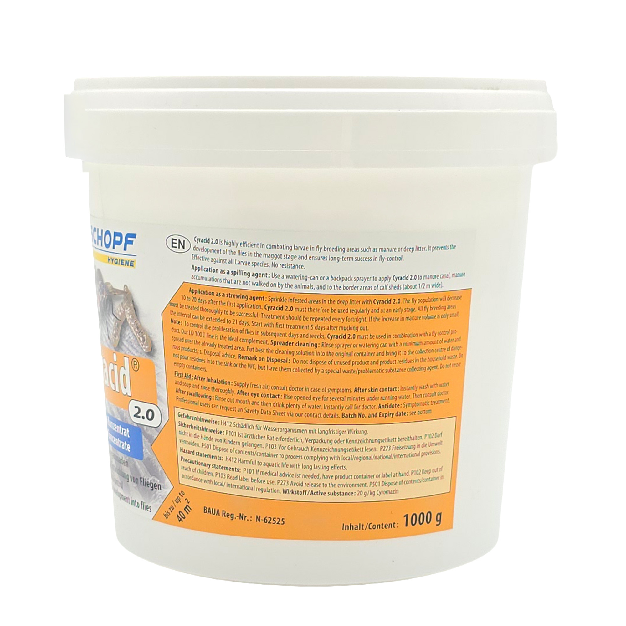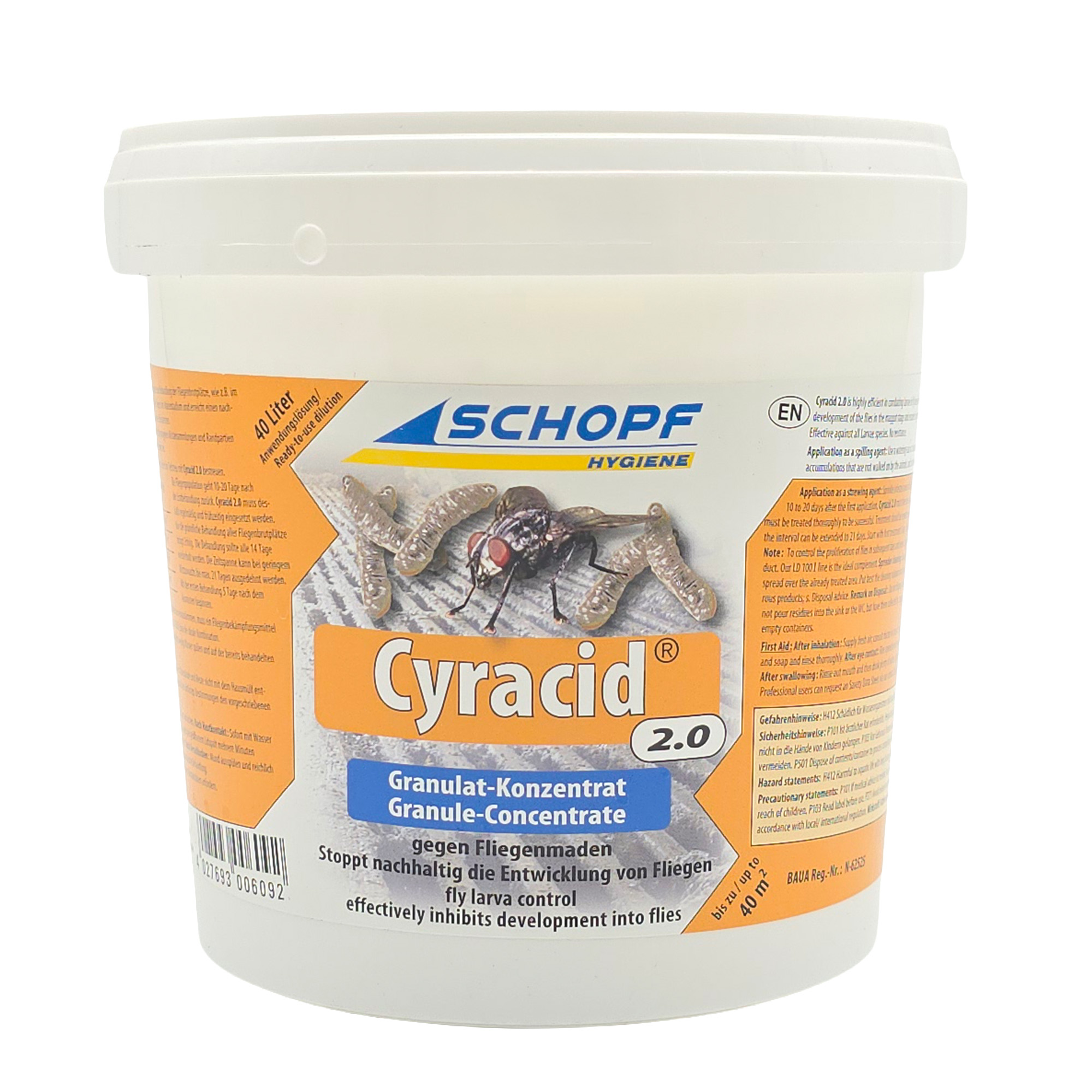- Cyracid 2.0 ist ein hervorragendes, hochwirksames Gieß- und Streumittel zur Behandlung der Fliegen-Brutplätze wie z.B. im Mist oder in Tiefstreulagen im Kälberstall. Cyracid 2.0 wirkt gegen Fliegenmaden sowie gegen Rattenschwanzlarven und bekämpft die Fliegen schon in der Entstehung. Dadurch geht die Fliegenpopulation nach 10 bis 20 Tagen der Erstbehandlung deutlich zurück