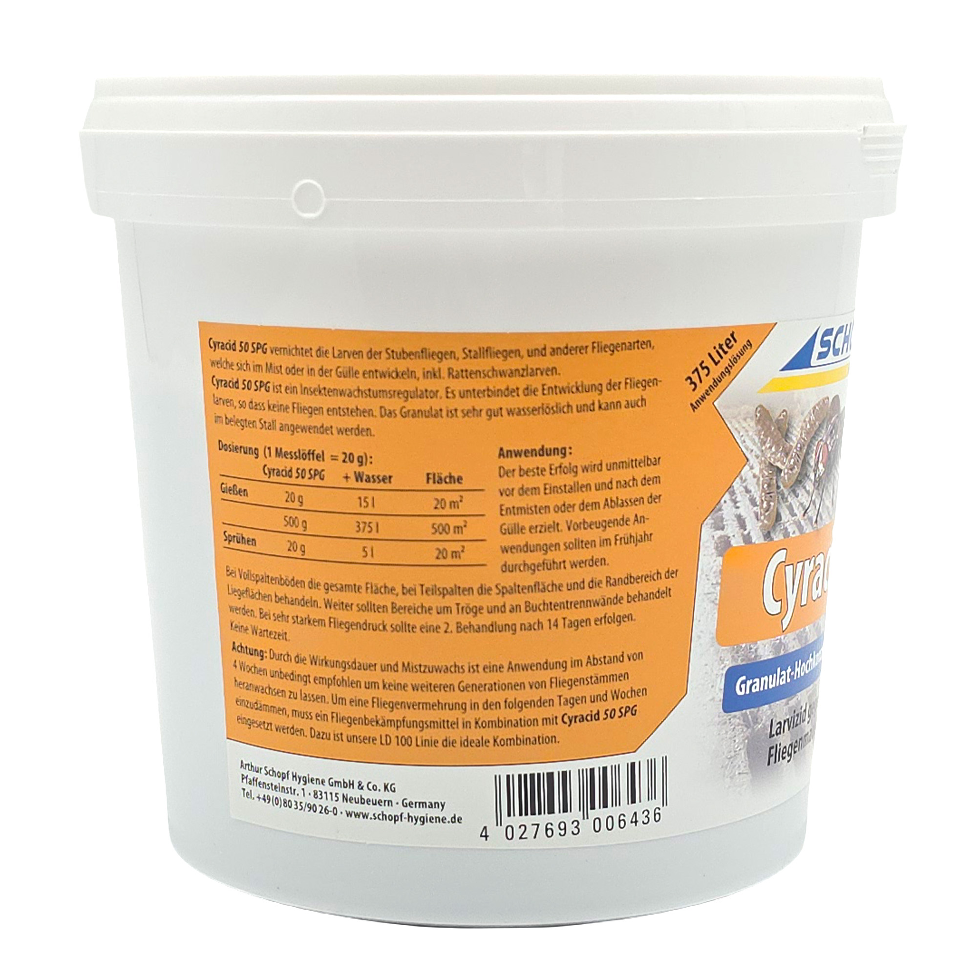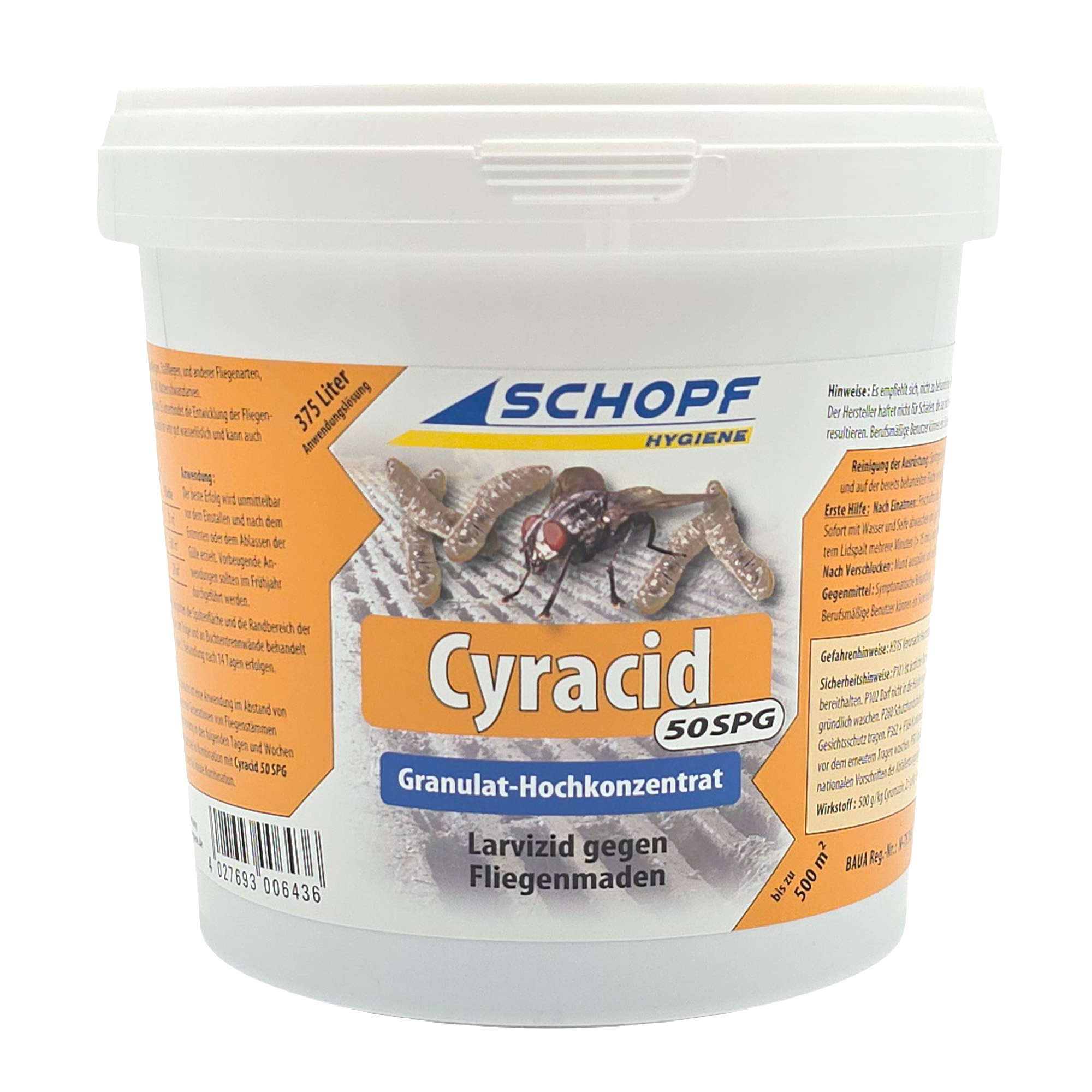 - Cyracid 50 SP ist ein hervorragendes, hochwirksames Gieß- und Streumittel zur Behandlung der Fliegen-Brutplätze wie z.B. im Mist oder in Tiefstreulagen.