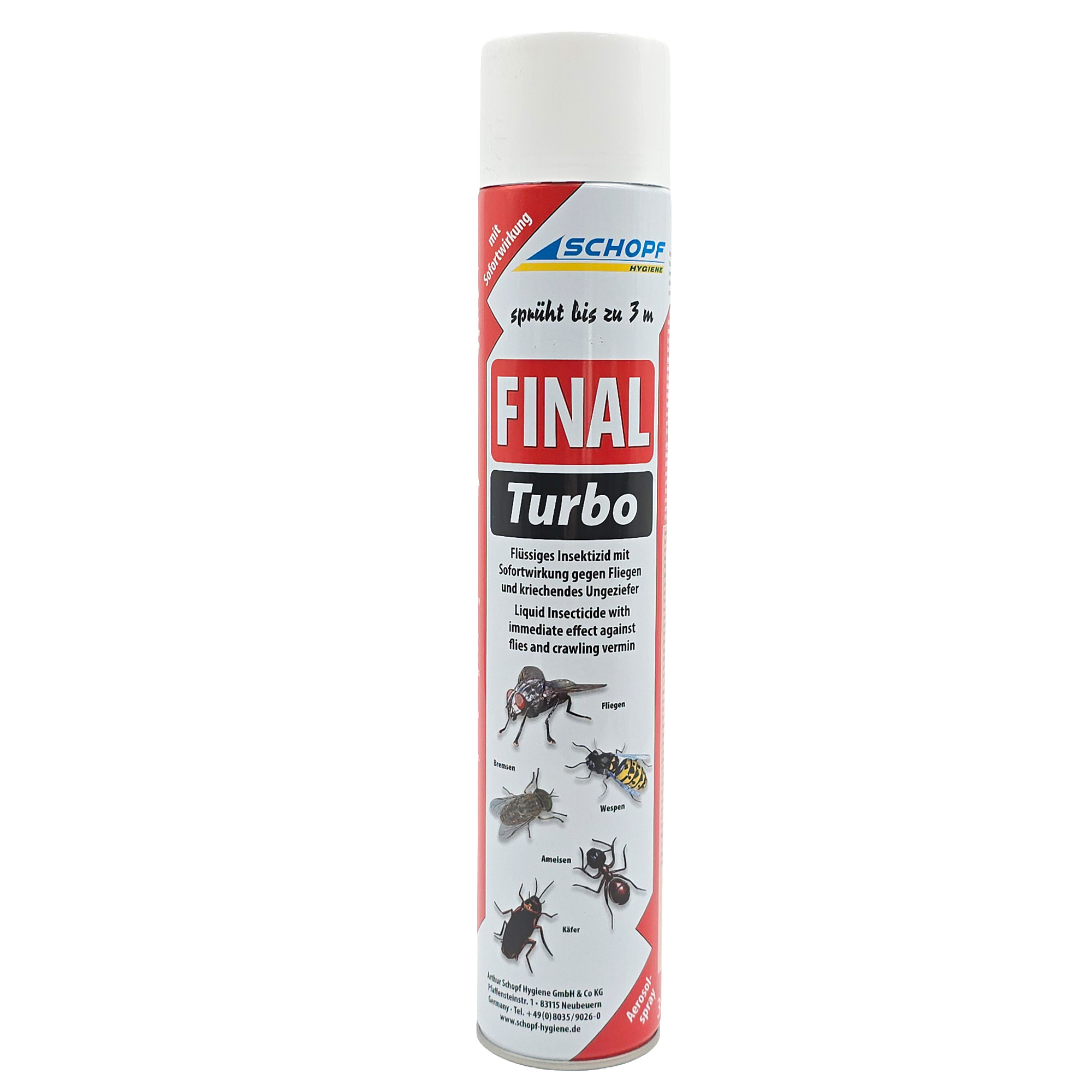 - Final Turbo Insektenspray wirkt sofort und gibt anhaltenden Schutz. Final Turbo verwendet man bei kriechendem Ungeziefer wie z. B. Schaben, Ameisen, Silberfischen, Käfer, Milben, Flöhe, Motten und bei Fliegen, Mücken und Wespen.