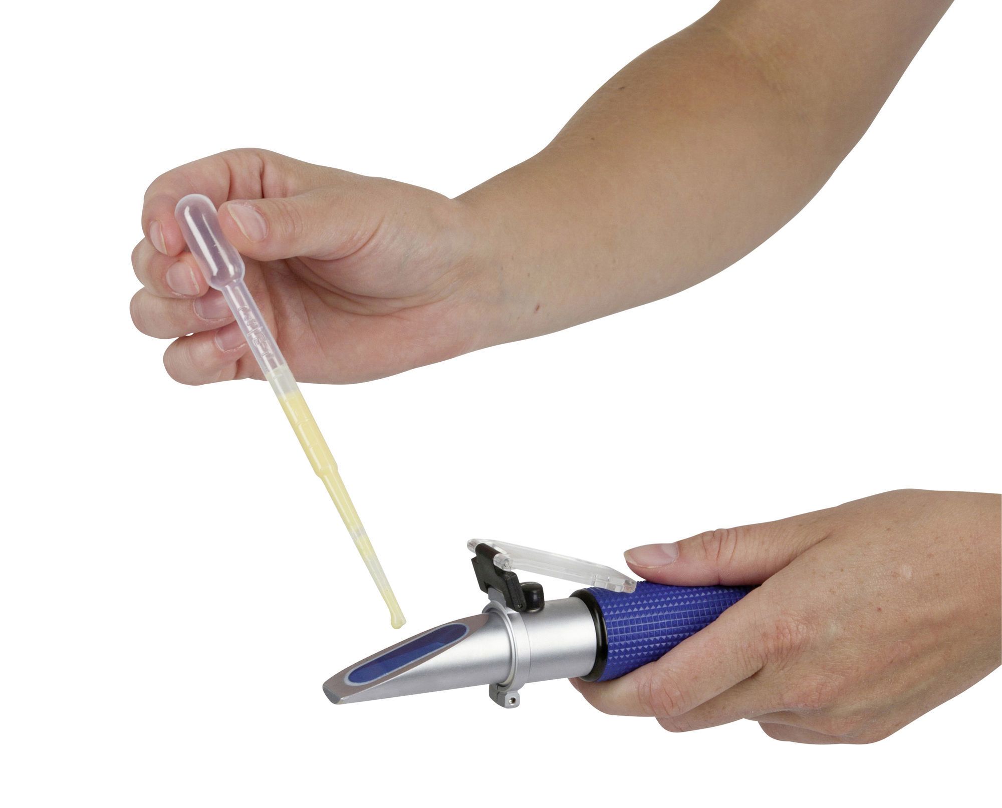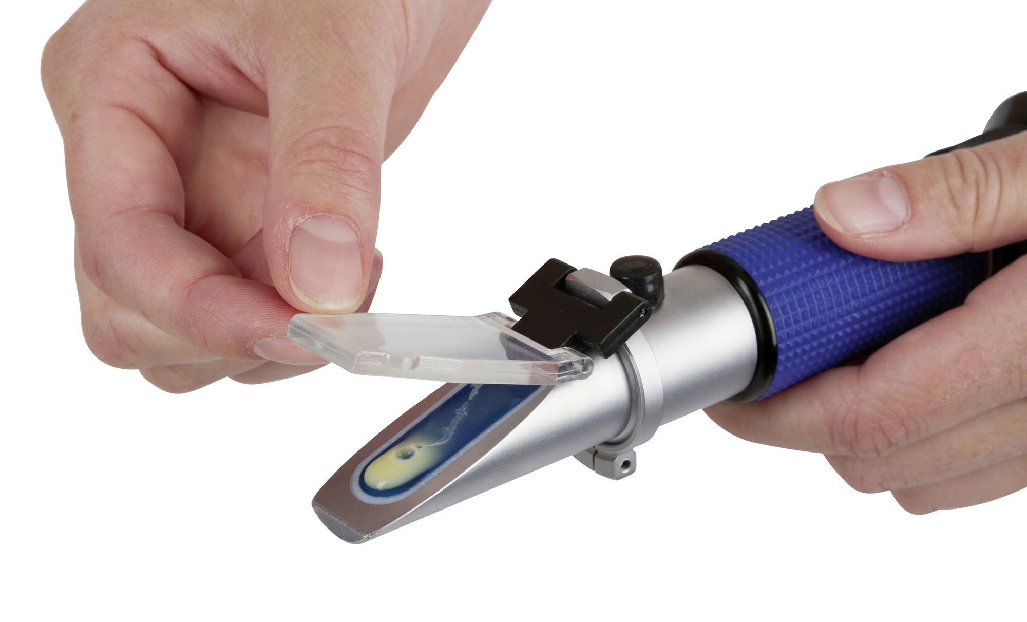 - Einfach wenige Tropfen des Kolostrums auf die Linse geben, Refraktrometer in Richtung Licht halten und den Wert (% Brix) ablesen. Der Brix-Wert kann einem Immunglobulingehalt zugeordnet werden.