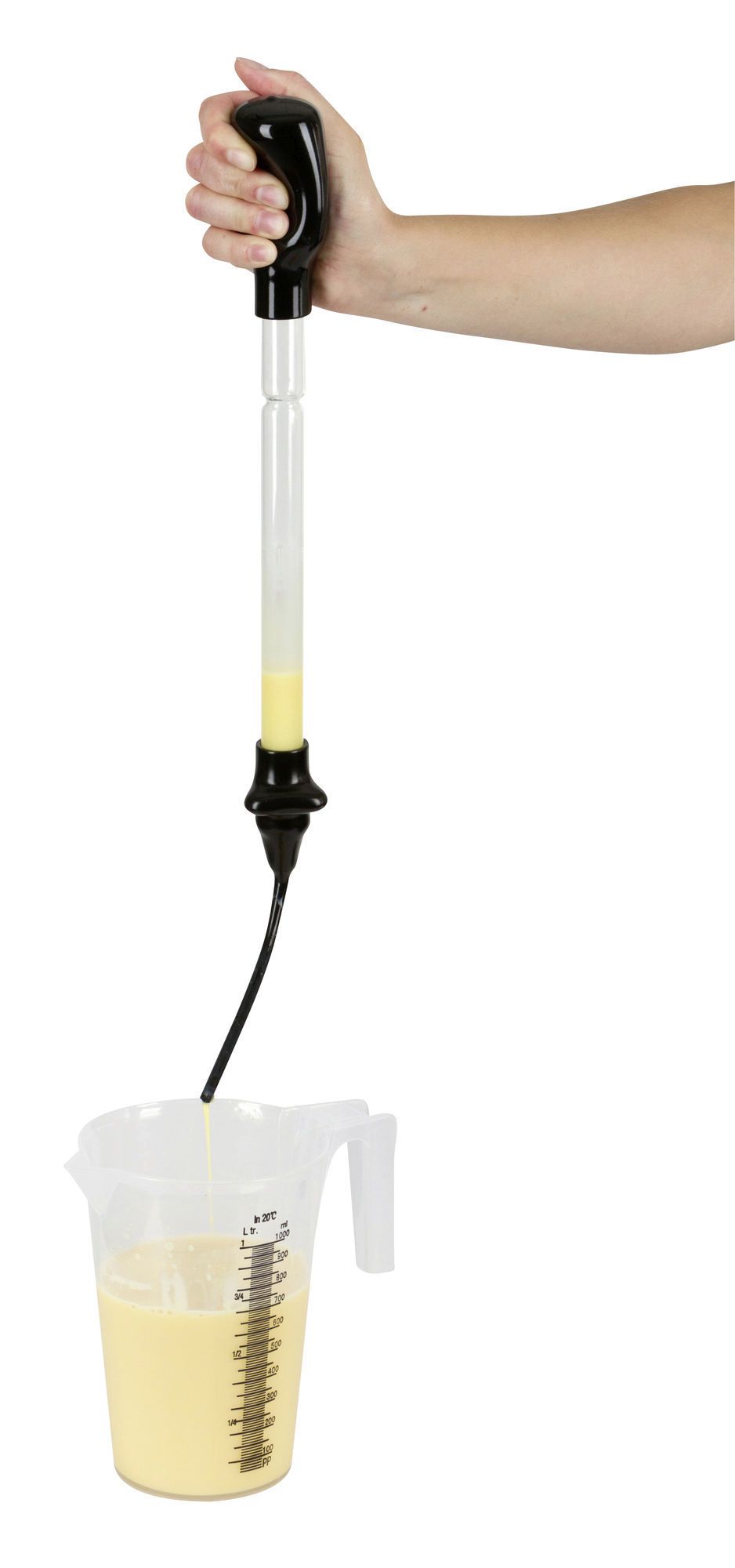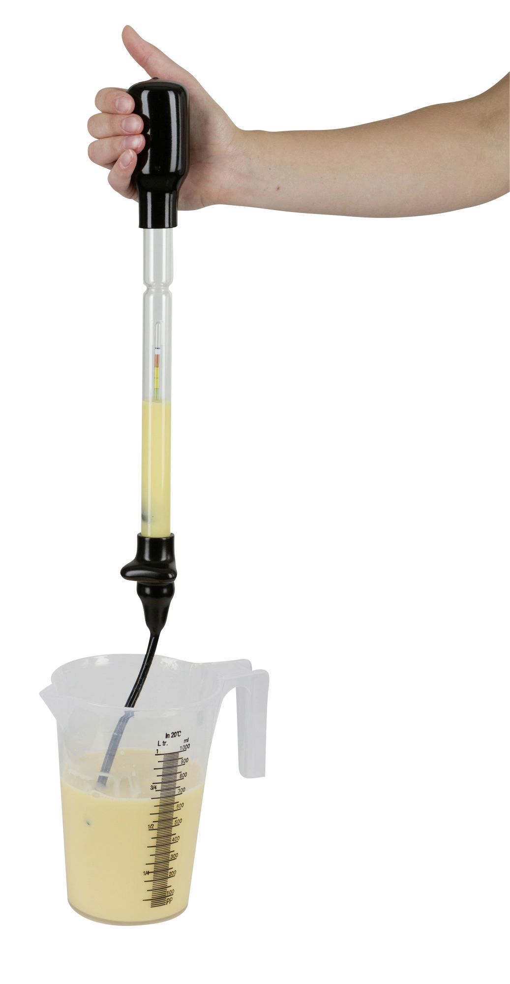 - Je mehr Antikörper in der Biestmilch enthalten sind, desto höher ist die spezifische Dichte und desto stärker ist der Auftrieb. Die Spindel taucht dichteabhängig mehr oder weniger tief in die Milch und die Qualität lässt sich auf der Farbskala der Spindel ablesen.